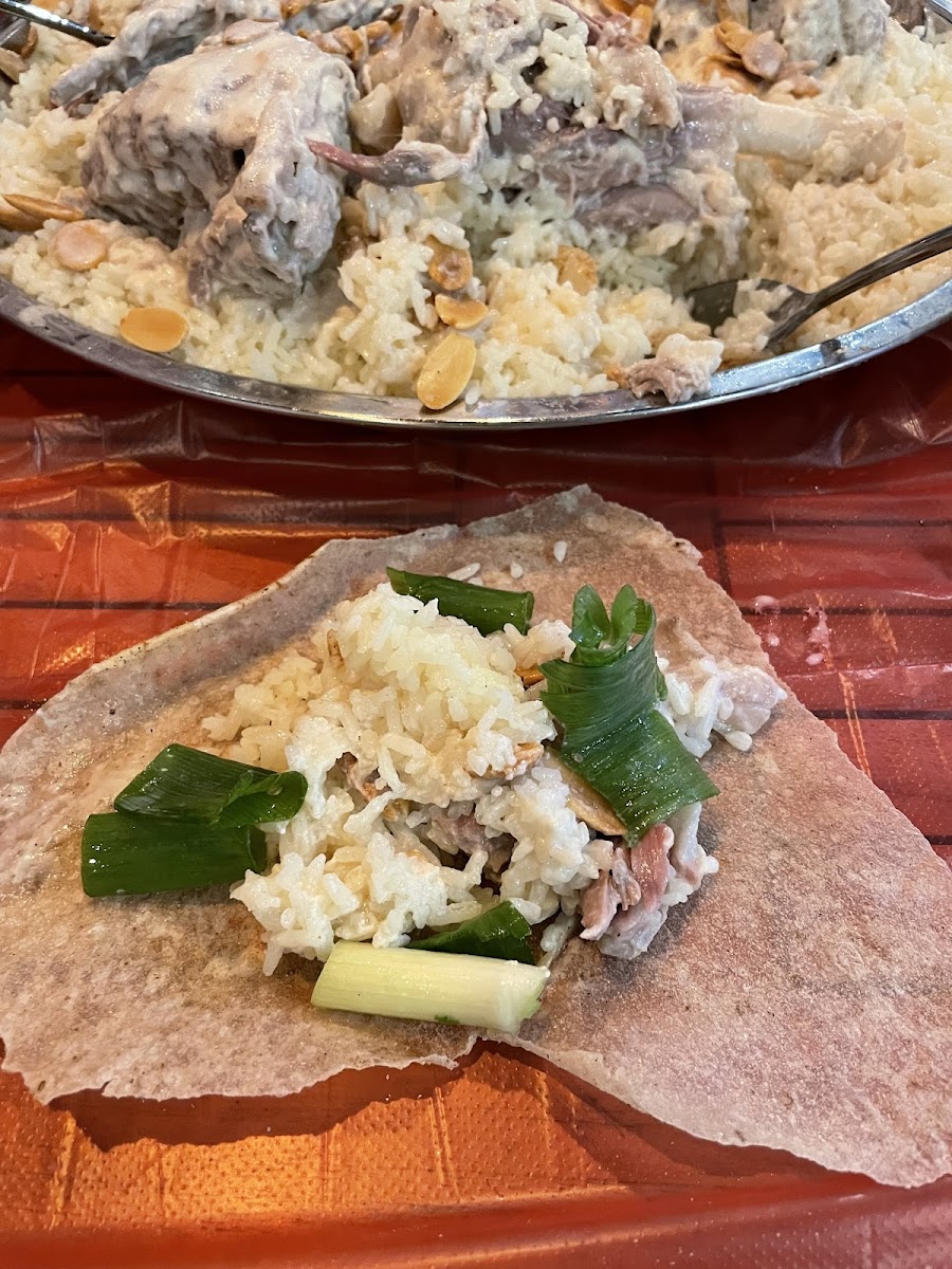 This is not a fancy place and come expecting to use your hands. There’s not much explanation you get the thing of rice with lamb on top of it and a pitcher of yogurt that you pour over it do not over order. It is very filling and don’t forget there’s Arab bread underneath.